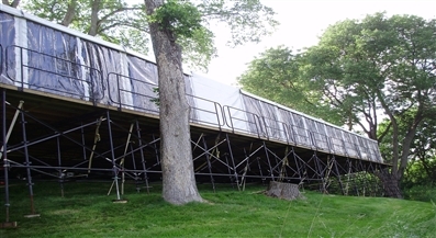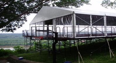 All Occasions’ Raised Laser Leveled floor system is a great way to gain usable event space if your site is not level. Our floor system can be installed on grade changes up to 15′. We can install this floor system over fountains, pools, around trees, and over landscaping. It is available with ramps, stairs and railings. Carpet and turf are available in a variety of colors and styles to match your event decor. A site survey is required to receive pricing for this floor system.